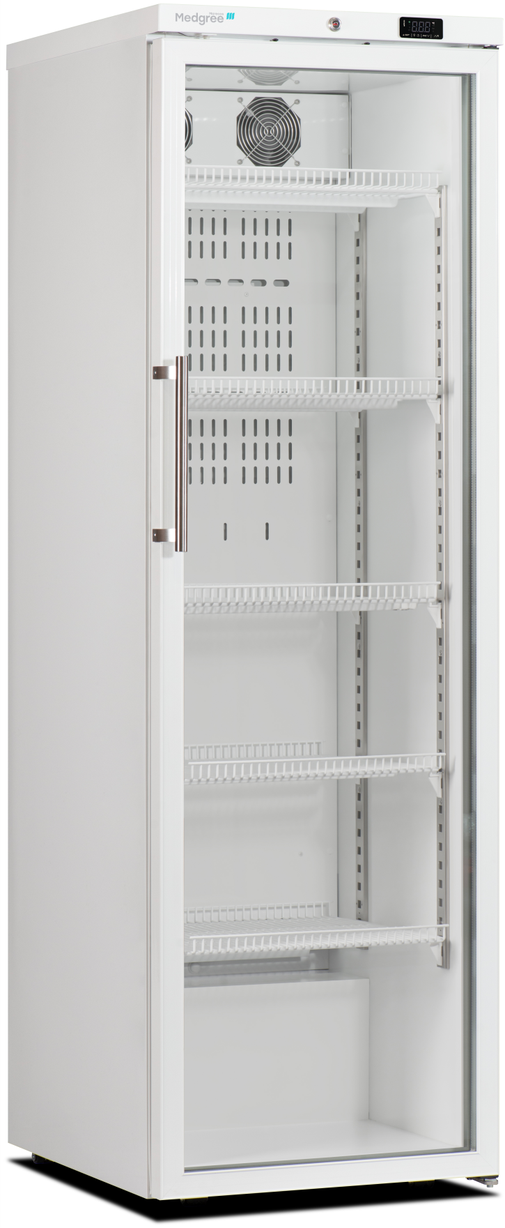 Hladnjak unutrašnjeg volumena od 416 litara i rasponom temperature od +2°C do +15°C sa staklenim vratima.